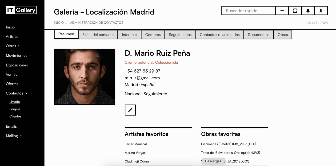 ITGallery te permite registrar los intereses artísticos de tus contactos; éstos aparecerán en la ficha del contacto. Utiliza este campo para después filtrar más fácilmente a tus contactos en las búsquedas. Por ejemplo, encuentra a todos aquellos contactos que han mostrado interés en adquirir obras cuyos precios se encuentran en un rango de precios determinado.*