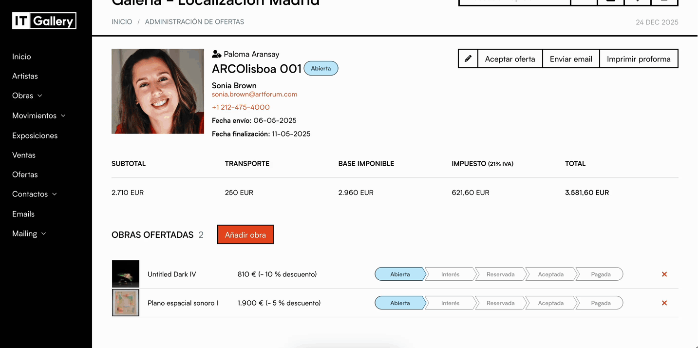 Cada obra incluida en una oferta tiene su propio estado independiente, lo que te permite llevar un control detallado del proceso de decisión y compra por parte del cliente. Estos estados reflejan en qué punto del embudo de venta se encuentra cada obra ofertada.