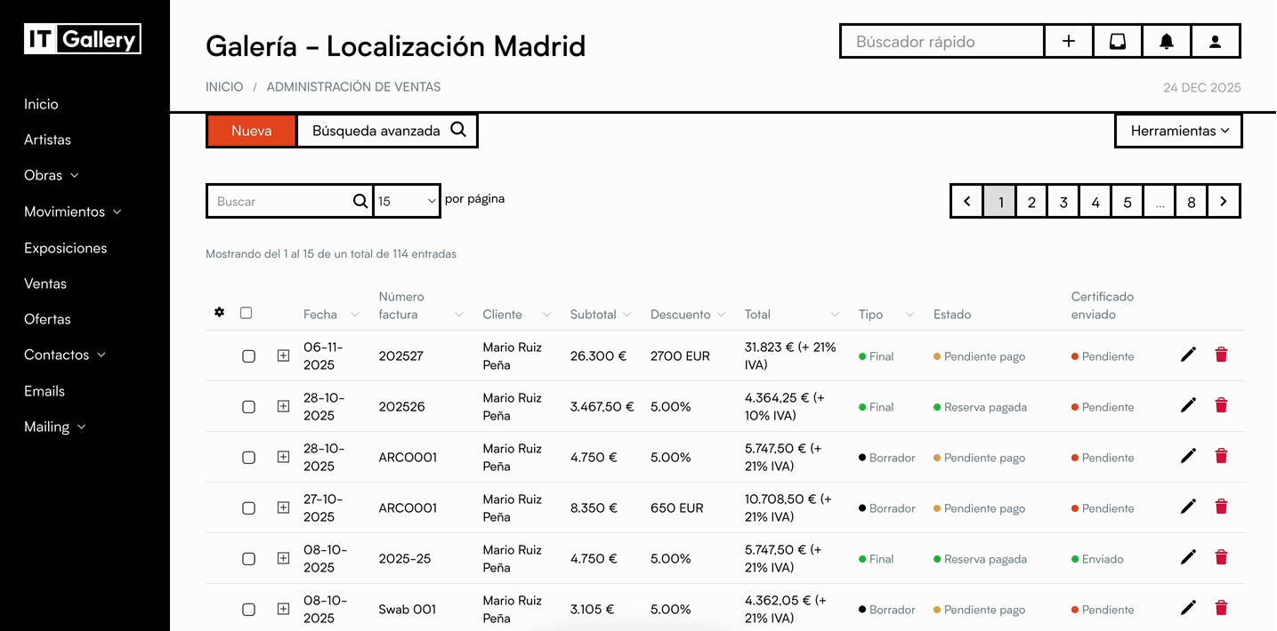 - En el módulo 'Ventas', dentro del listado, selecciona la venta cuya factura quieras enviar, marcando la casilla blanca