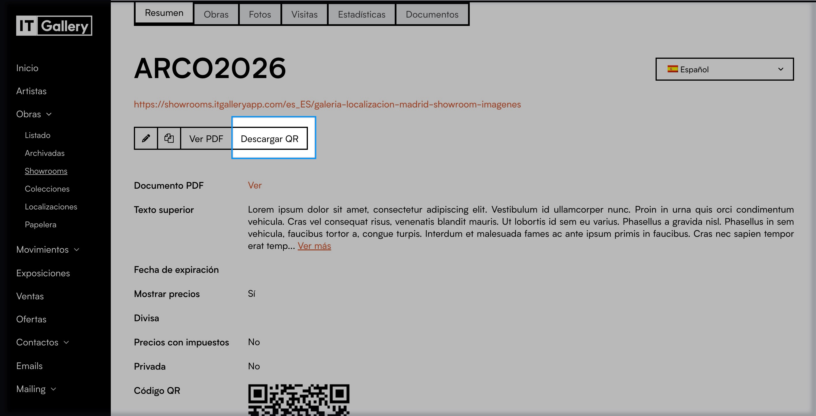 Además de la URL, cada showroom genera automáticamente un código QR único del showroom para facilitar el acceso desde dispositivos móviles.