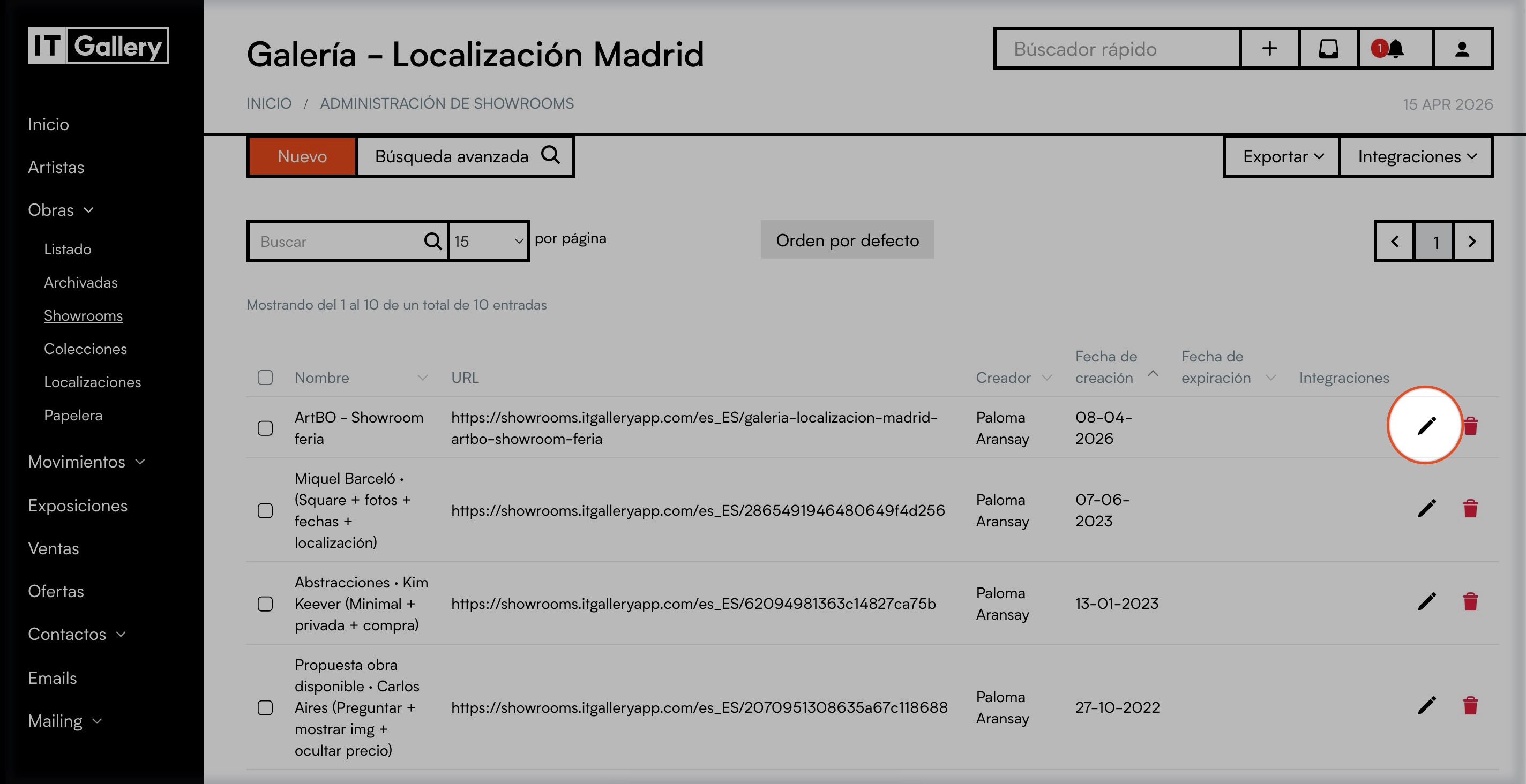 Permite consultar la actividad del showroom y analizar el comportamiento de los usuarios, incluyendo visitas, obras más vistas e interacción general.