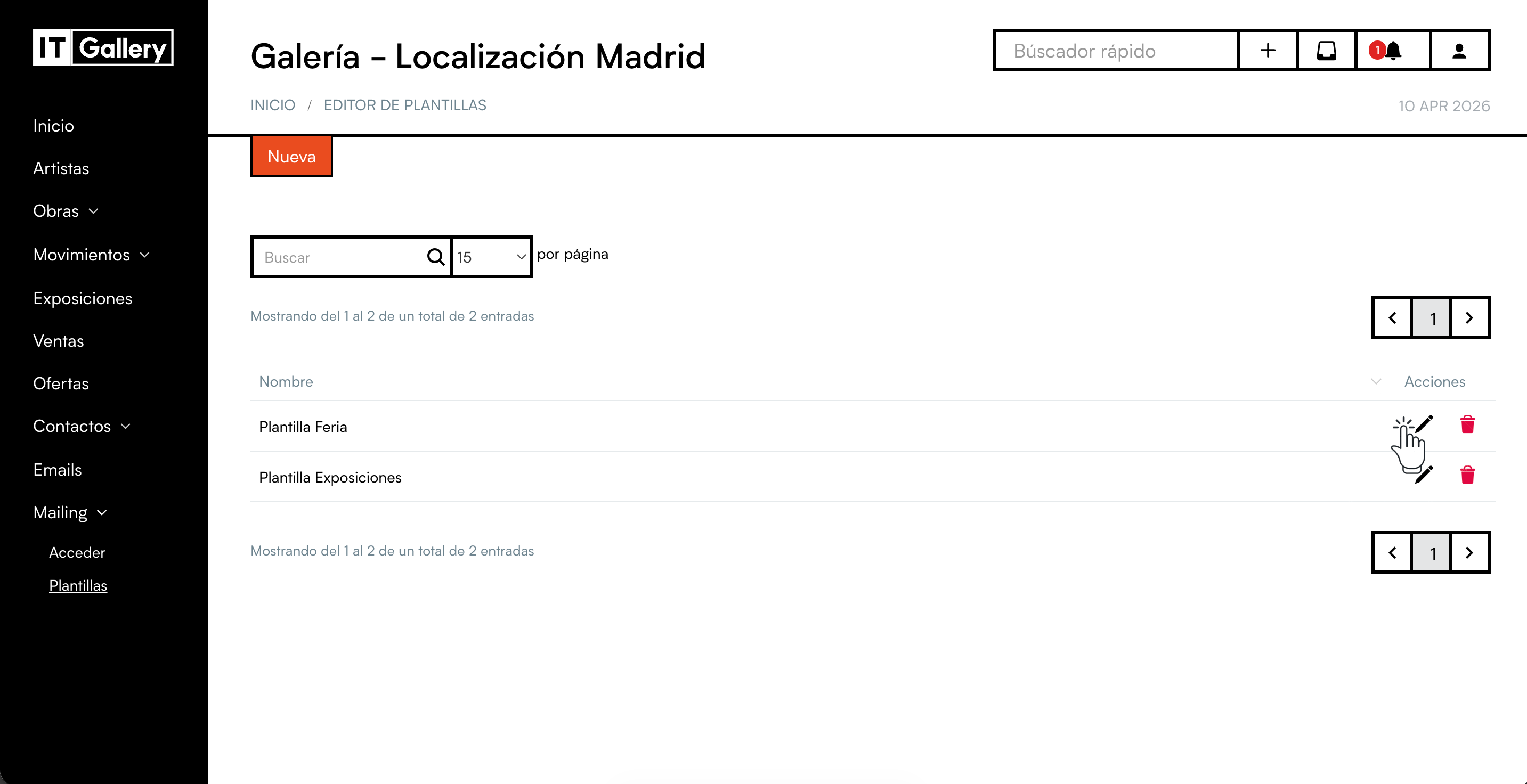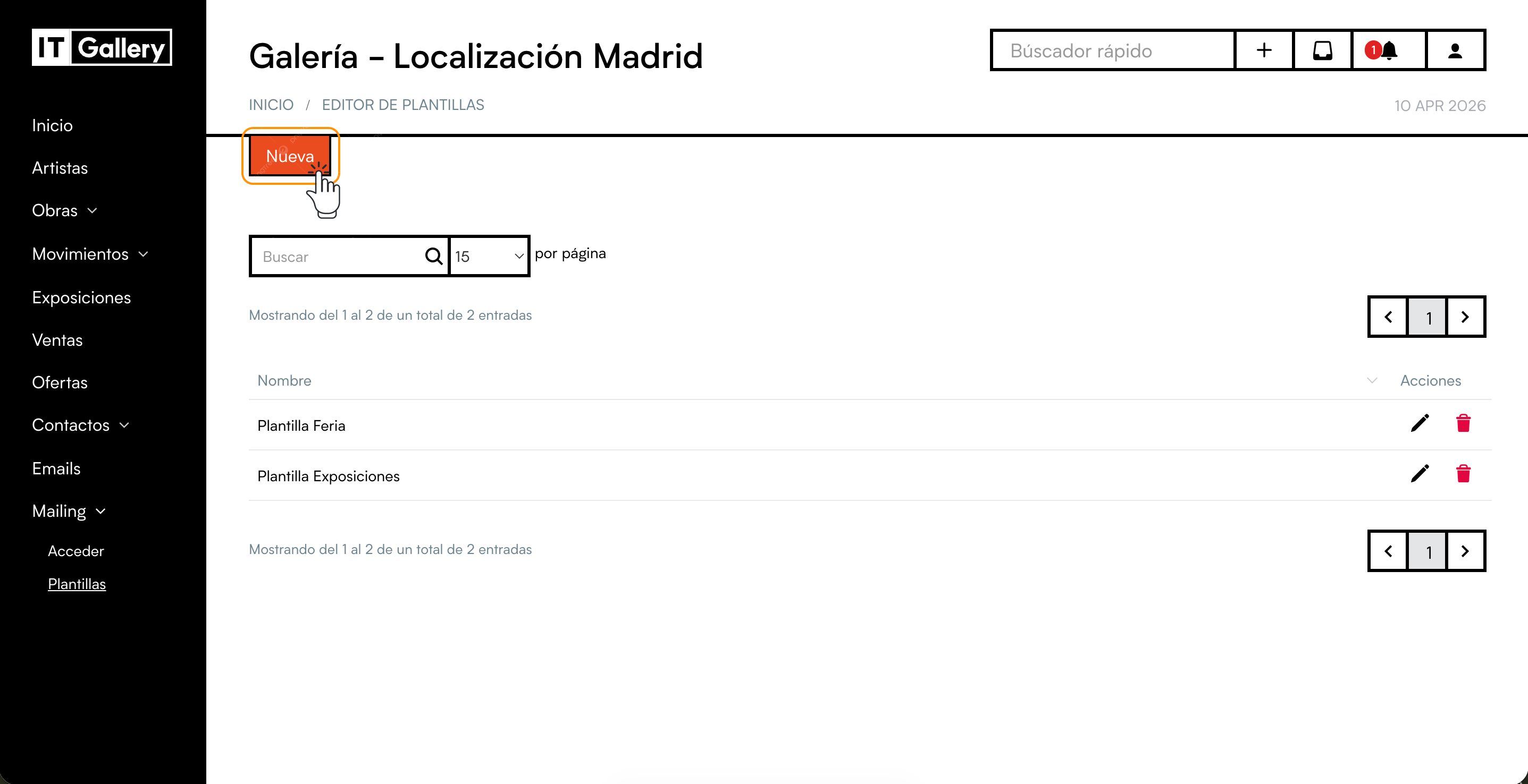 - Conforme vayas creando plantillas, se mostrarán en un listado.