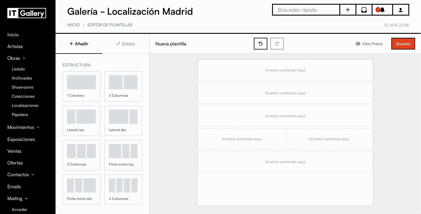 - Obra de arte: Inserta una obra directamente desde tu base de datos de ITGallery, mostrando automáticamente información como imagen, artista, título, técnica o medidas.