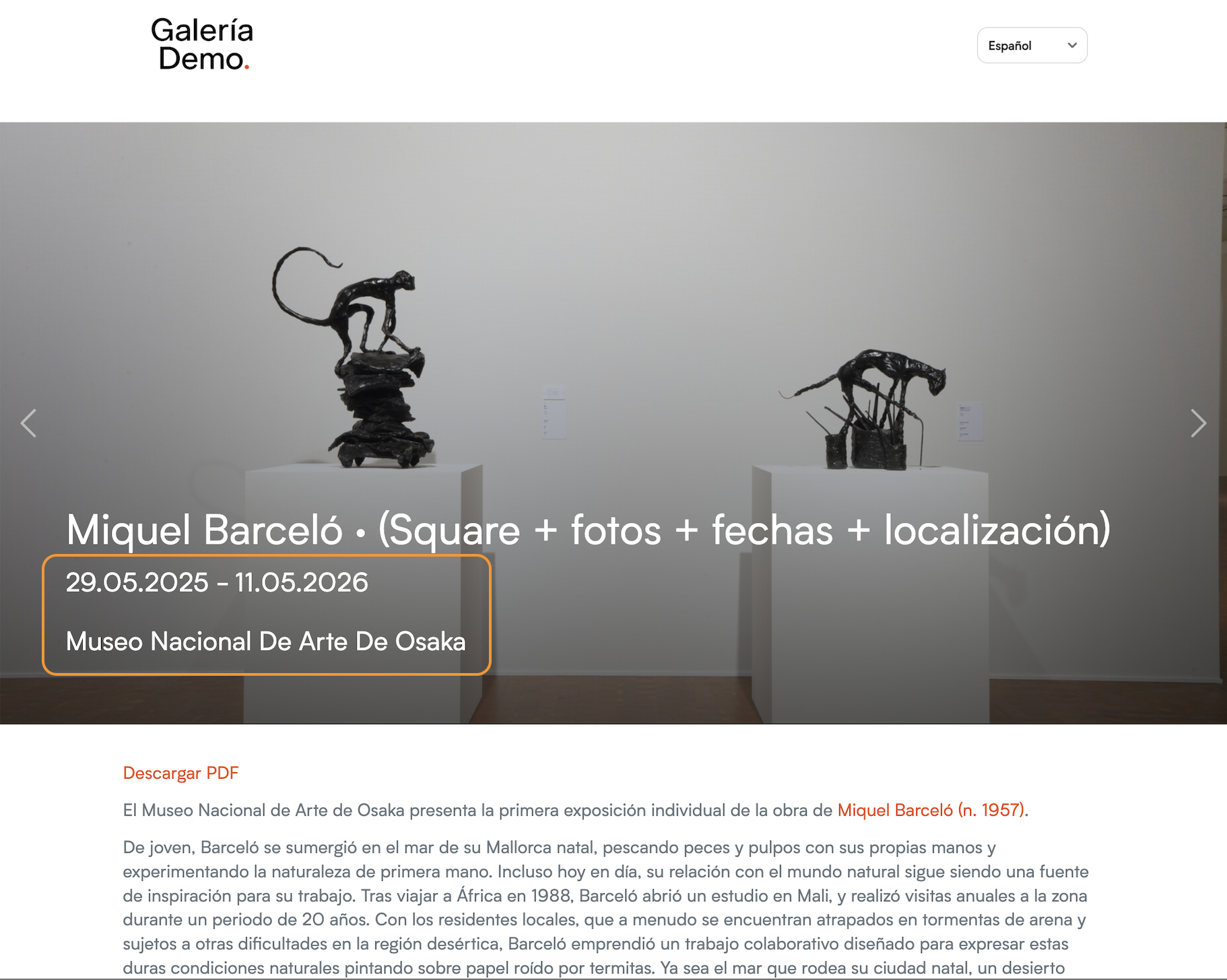 Si creas un showroom directamente desde una exposición, los campos de fecha y localización se completarán automáticamente con la información registrada en la ficha de esa exposición. Si no quieres mostrar esta información en el showroom, puedes eliminar esos campos en la edición del showroom y no afectará a la exposición original.