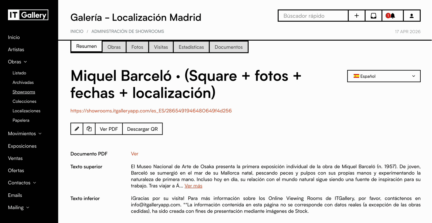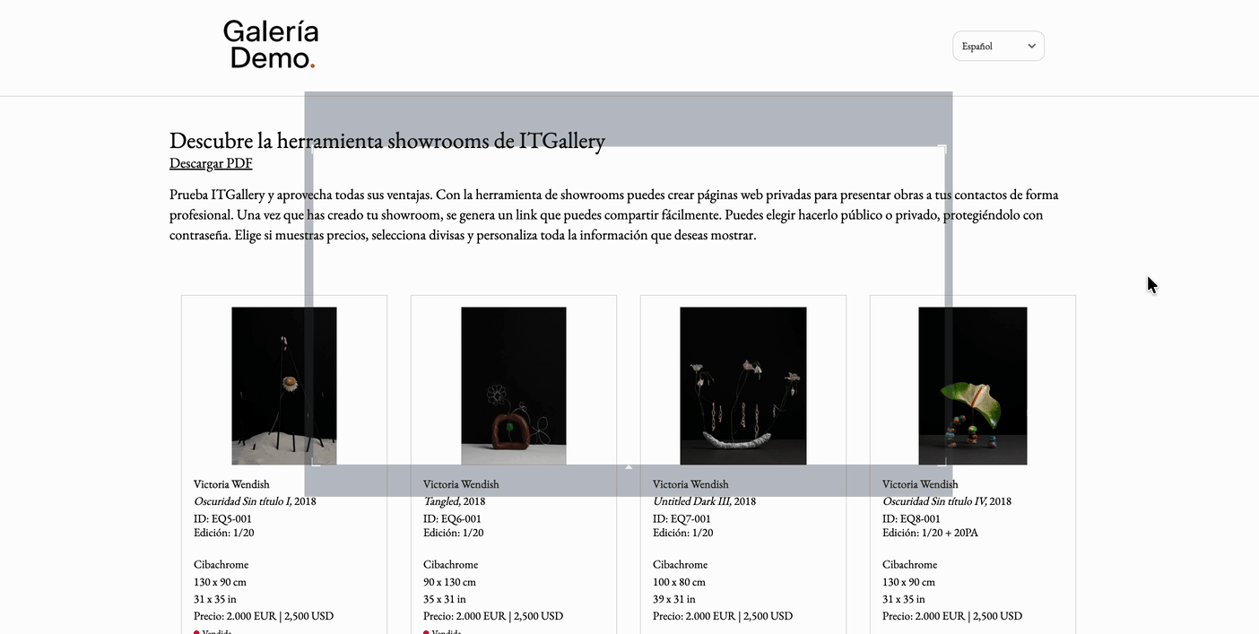Si una obra no tiene contenido disponible en el idioma seleccionado, el showroom mostrará la información en el idioma principal de tu cuenta de ITGallery.