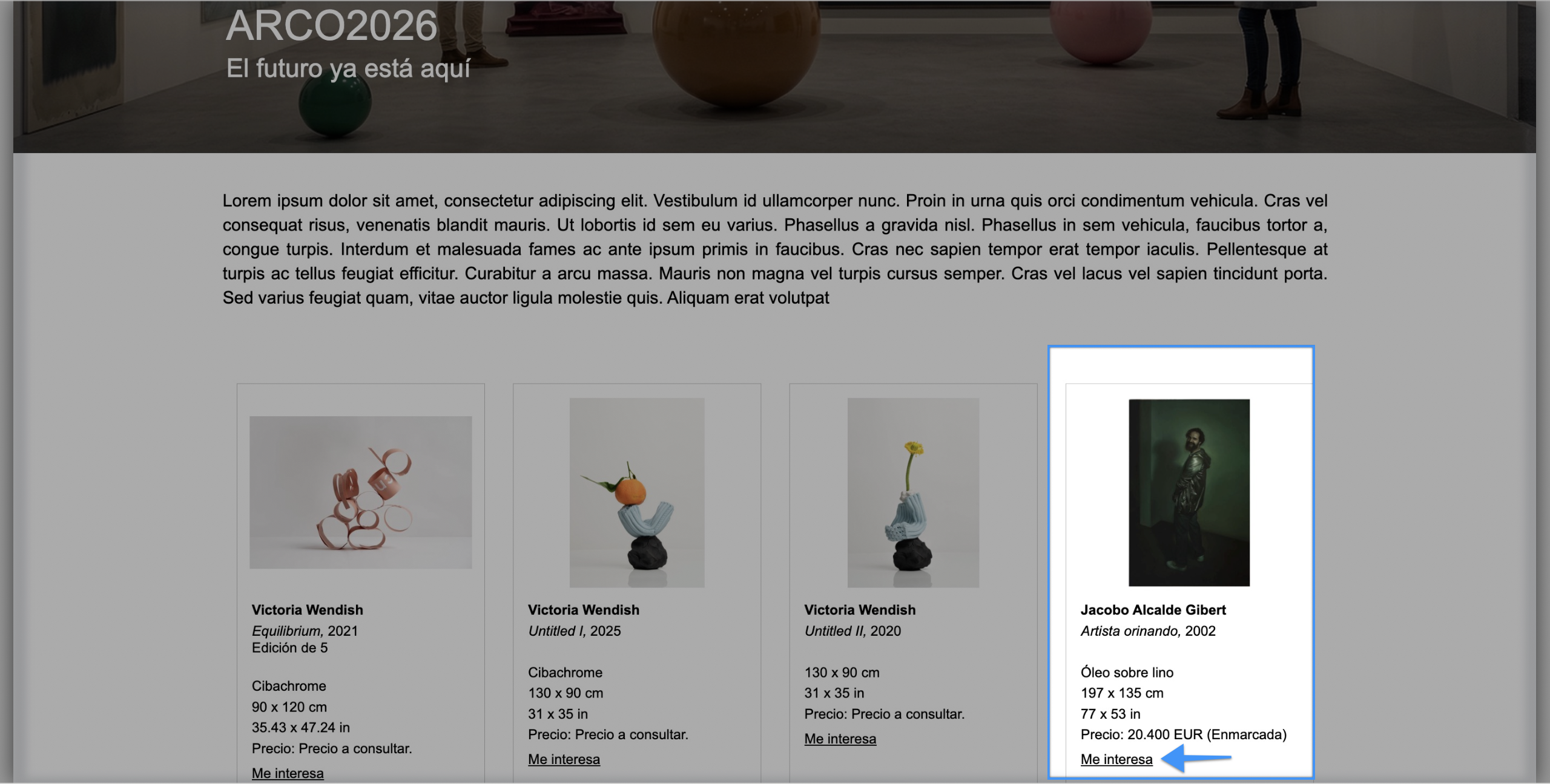 Activa el botón “Me interesa” en el listado cuando tengas muchas obras y quieras facilitar el contacto rápido sin que el usuario tenga que acceder a cada ficha.