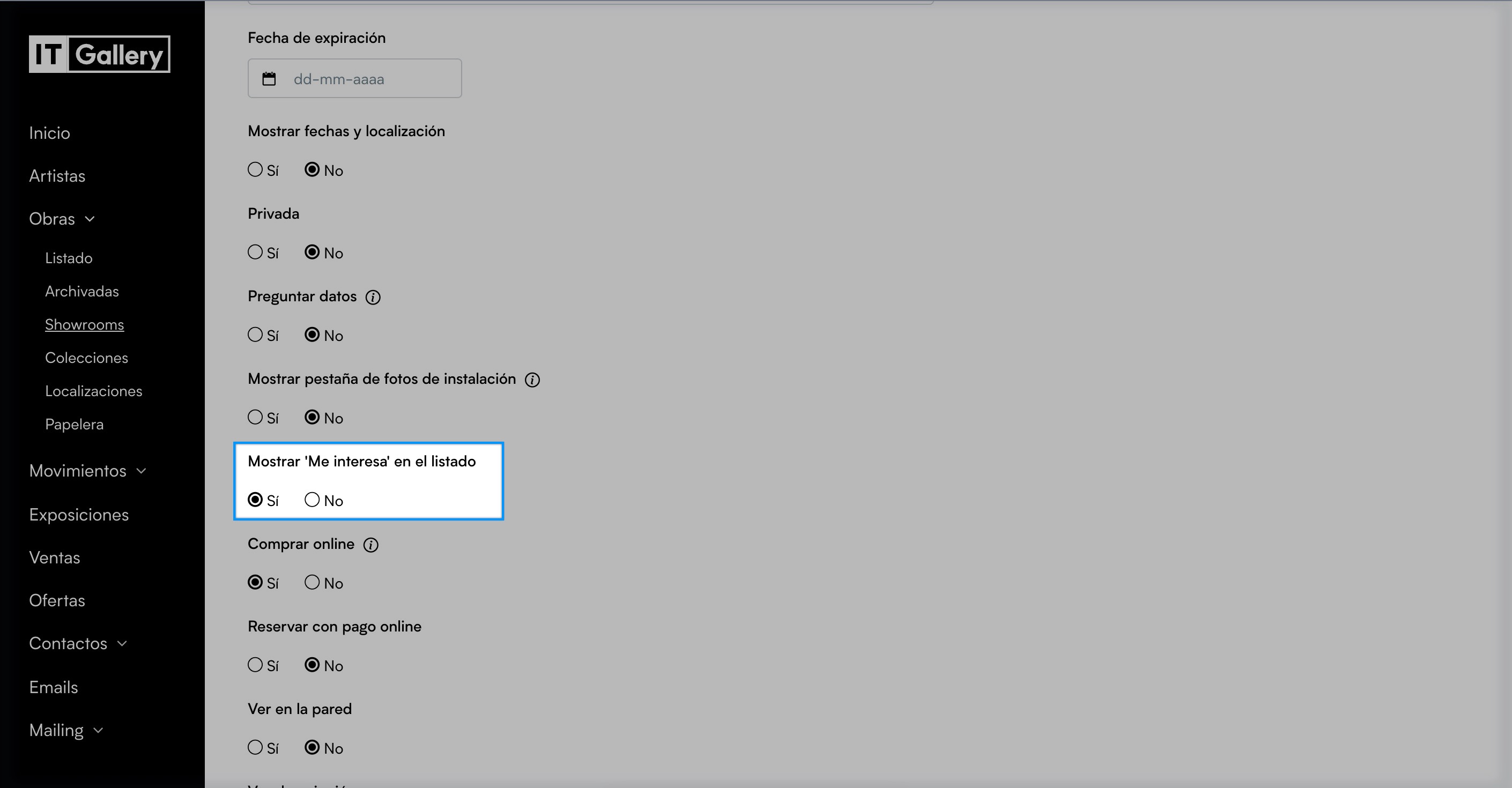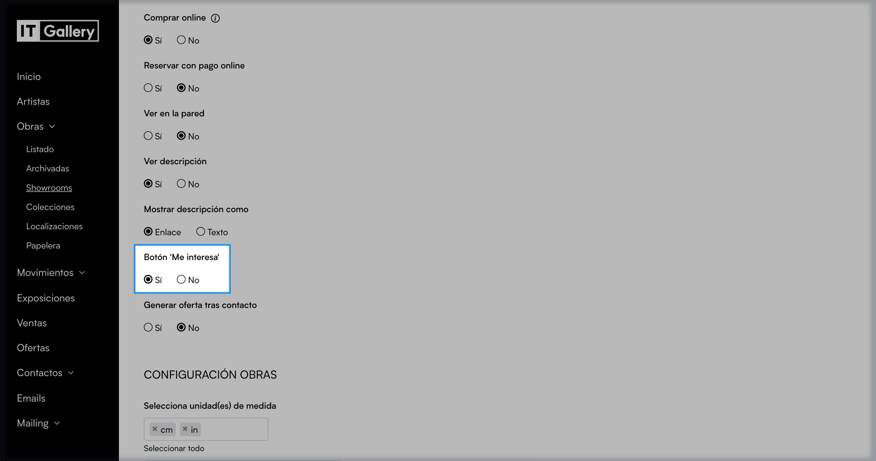 Puedes activar el botón “Me interesa” tanto en la ficha de la obra como en el listado desde la configuración del showroom.