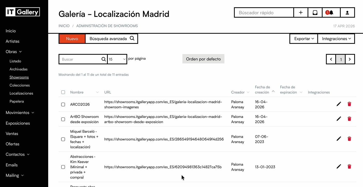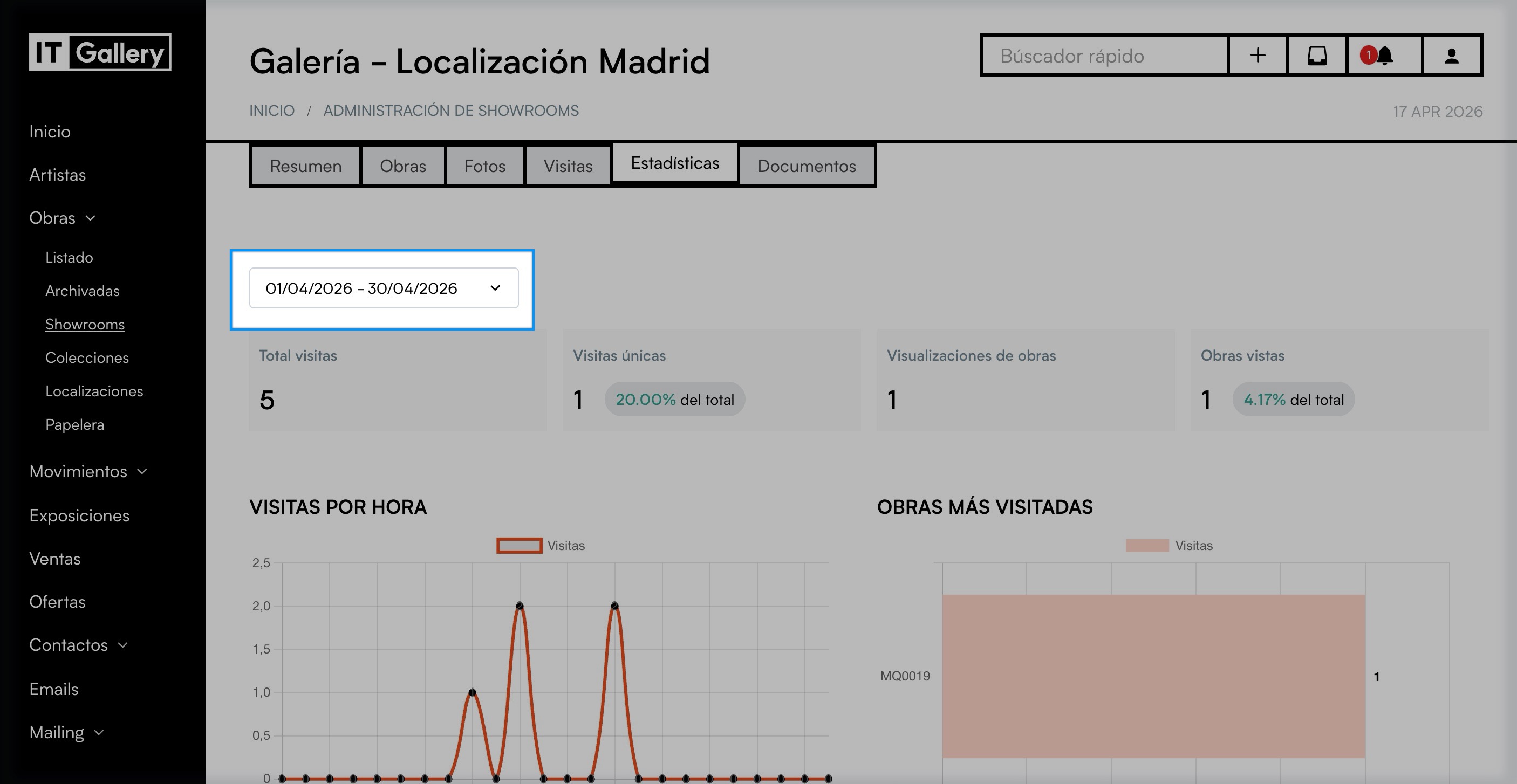 Puedes consultar las estadísticas de un showroom para analizar su rendimiento y ver cómo interactúan los usuarios con el showroom y las obras.