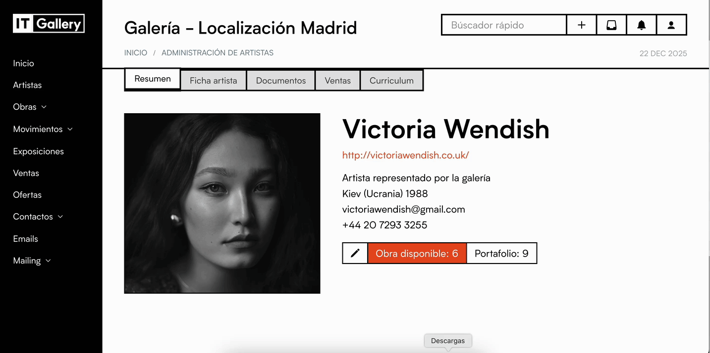 * Tip: utiliza esta pestaña para registrar toda la información relativa al artista que pueda resultar de utilidad a nivel interno de la galería, como su CV o facturas con los gastos de producción de una nueva obra.
