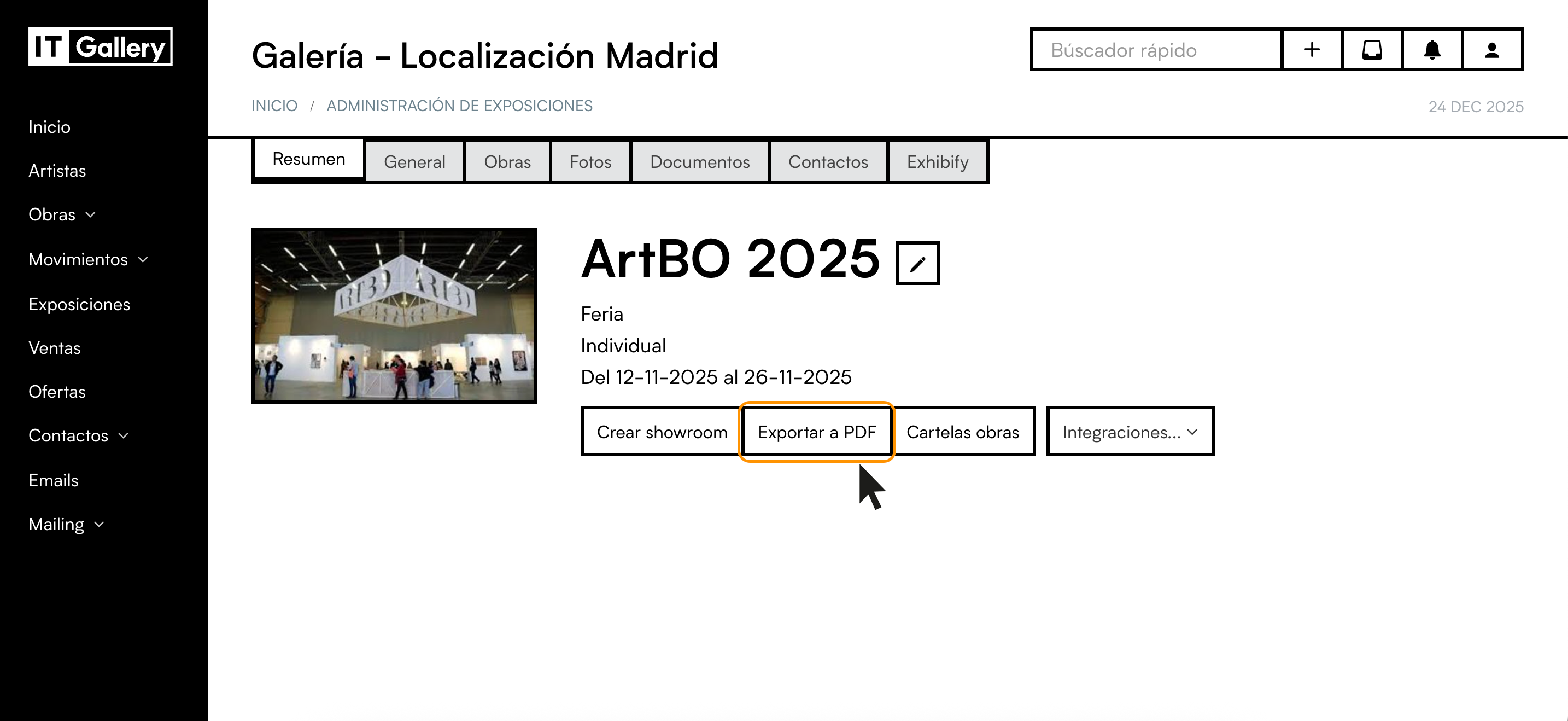 - Dentro de la ficha de la exposición, en la pestaña 'Resumen', haz clic en el botón 'Exportar a PDF'